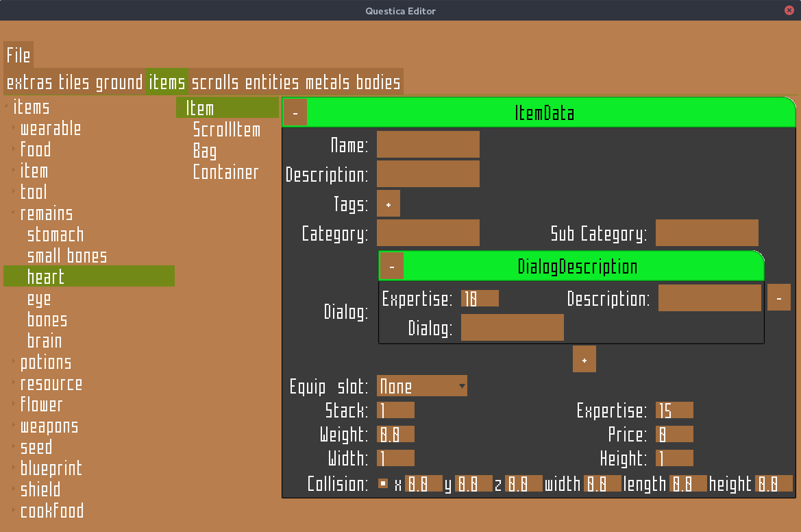 The editor will also change the Class of a specific object if you want it to be of a different subclass. Just clicking on one in the tree on the left will copy all of the data over to a more specific subclass with more fields. I am also planning on implementing a component system like in Unity.